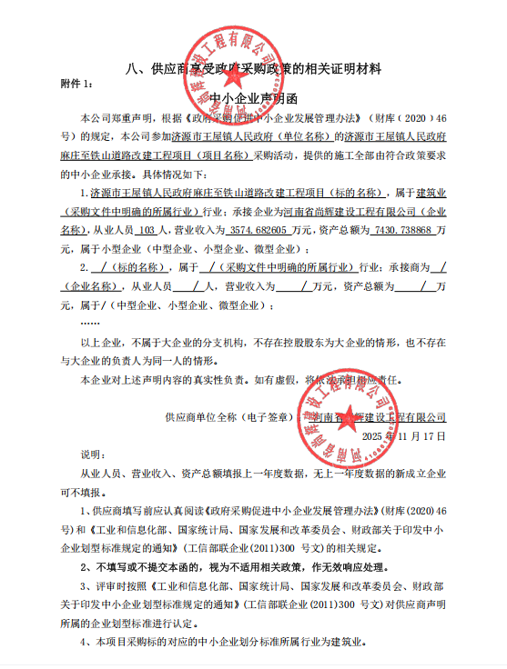 一、项目基本情况 1、采购项目编号:济源采购-2025-208 ******人民政府麻庄至铁山道路改建工程项目 3、采购方式:竞争性磋商 4、采购公告发布日期:2025年11月05日 5、评审日期:2025年11月17日 二、成交情况