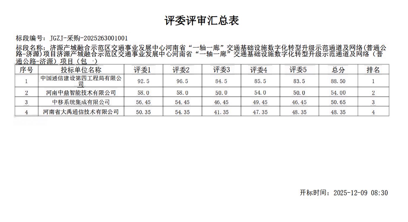 一、项目基本情况 1、采购项目编号:济源采购-2025-218 2、采购项目名称:济源产城融合示范区交通事业发展中心河南省“一轴一廊”交通基础设施数字化转型升级示范通道及网络(普通公路-济源)项目 3、采购方式:公开招标 4、招标公告发布日期:2025年11月18日 5、评审日期:2025年12月09日 二、采购项目用途、数量、简要技术要求、合同履行日期: 包一:普通国道自动化交调站建设:包含500万抓拍单元、900万抓拍单元、交通终端服务器、补光灯、智能维运机箱等设备;(因采购类别较多,具体内容详见招标文件。)