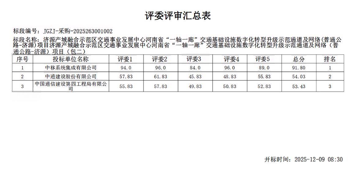 一、项目基本情况 1、采购项目编号:济源采购-2025-218 2、采购项目名称:济源产城融合示范区交通事业发展中心河南省“一轴一廊”交通基础设施数字化转型升级示范通道及网络(普通公路-济源)项目 3、采购方式:公开招标 4、招标公告发布日期:2025年11月18日 5、评审日期:2025年12月09日 二、采购项目用途、数量、简要技术要求、合同履行日期: 包二:普通公路智慧服务区建设:包含全景摄像机、全景摄像机杆件、热成像摄像机、热成像摄像机杆件、监控球形摄像机等设备。(因采购类别较多,具体内容详见招标文件。)